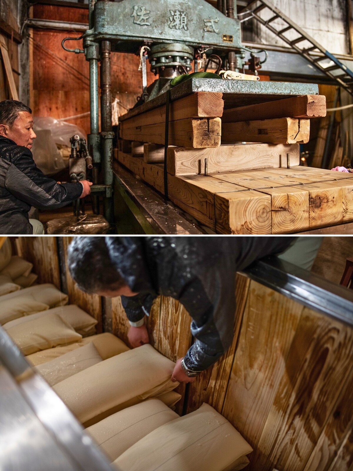 また、もろみを酒と酒粕に分離させる工程「搾り」。一般的な「薮田式」と呼ばれる方法は、空気圧で一気に搾るので1日もあれば作業が終わりますが、磐梯酒造が昔から続けているのは「佐瀬式」という方法。もろみを入れた袋を槽(ふね)と呼ばれる木枠に敷き詰め、二日間かけてゆっくり丁寧に搾ります。