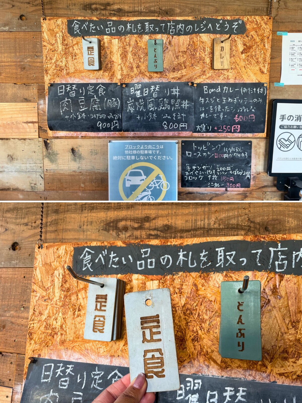 店の入り口には、ちょっと変わった仕組みがあります。というのもBondでは、玄関前に掛けられた木札を取って注文するスタイルなのです。「定食」「丼」「カレー」と書かれた木札を手に取り、レジで番号札と引き換えます。