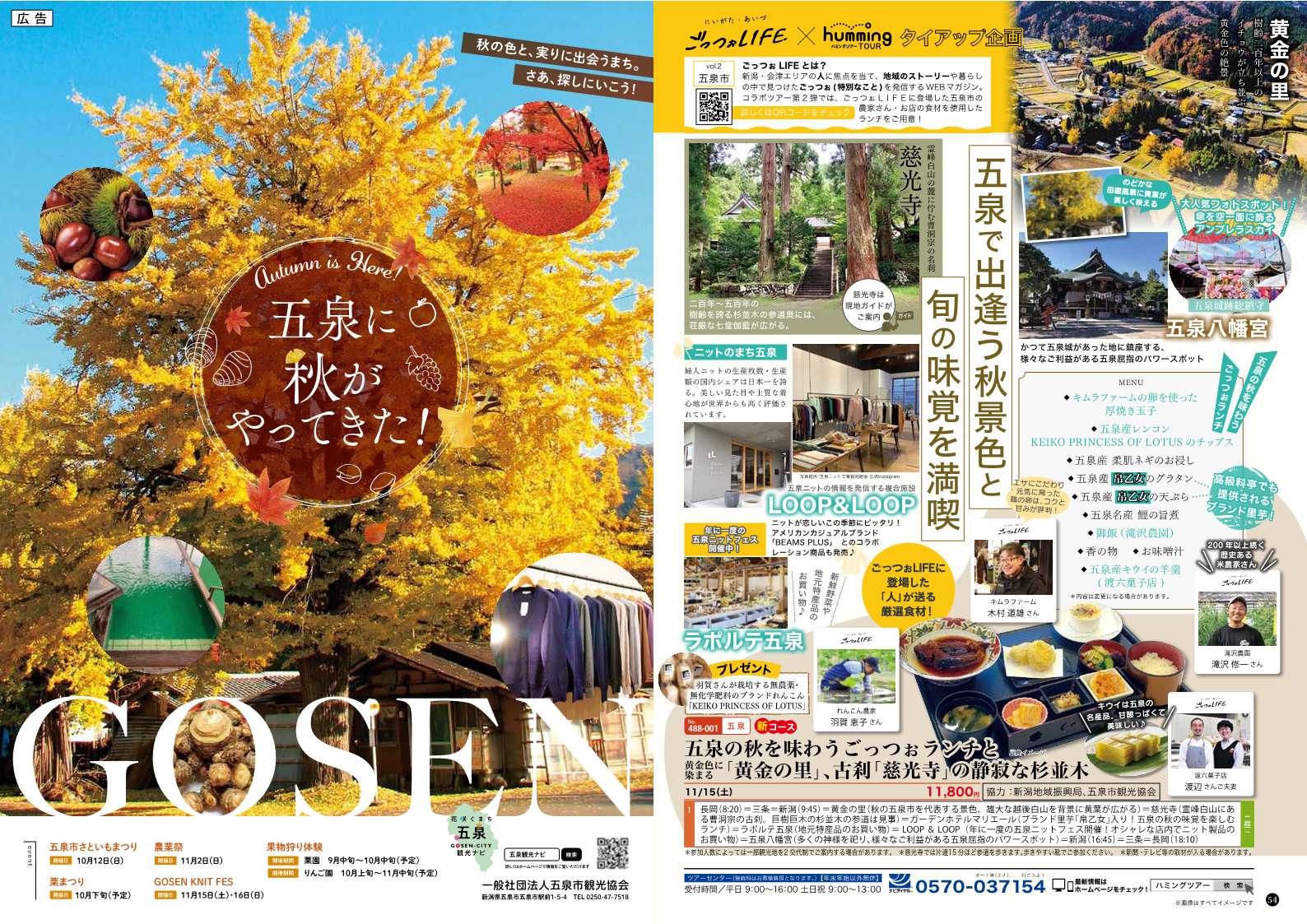 第2弾は、五泉の秋風景を満喫できるスポットなどを巡り、お昼には、ごっつぉLIFEに登場した五泉市の「人」が送る厳選素材を使ったランチが味わえる特別なツアーです!
