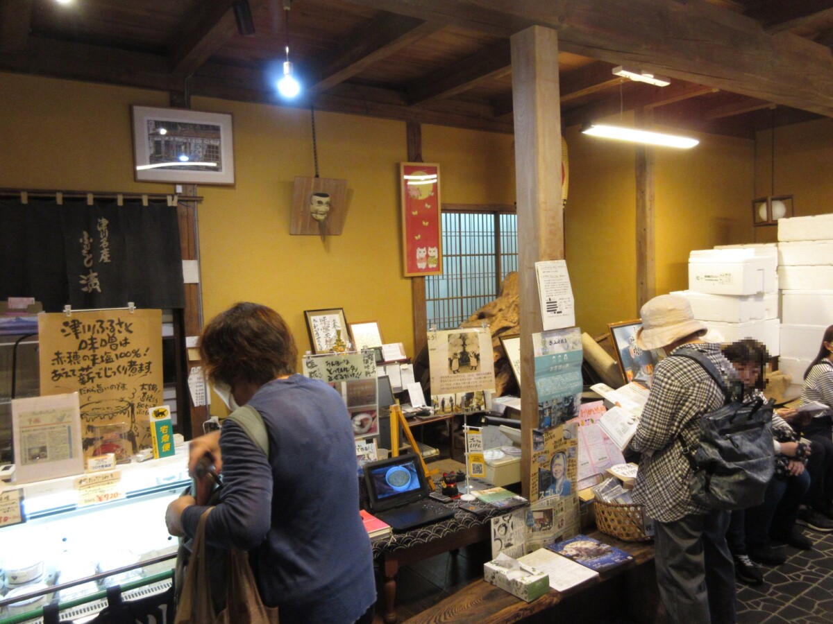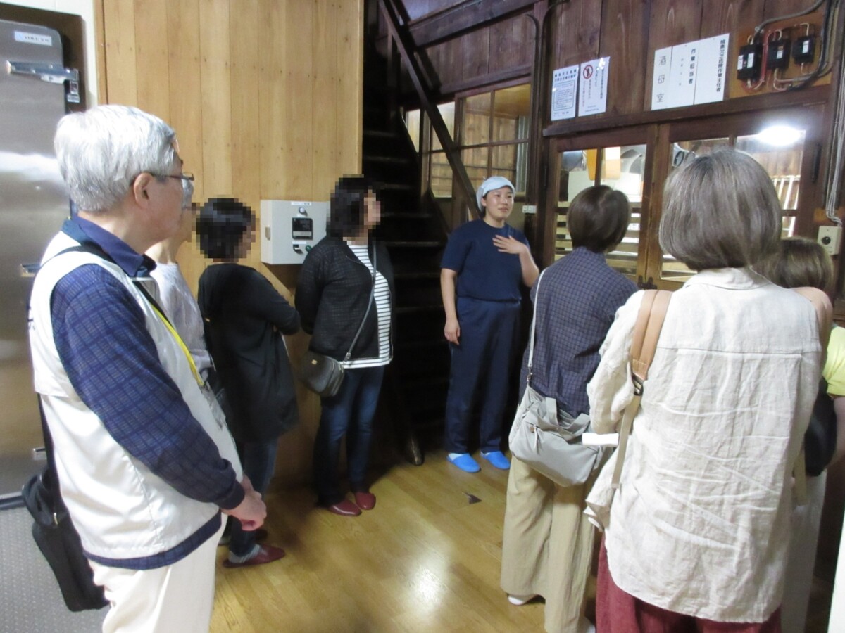 昼食のあとは、阿賀町観光ガイドの案内で、津川の雁木(とんぼと言います)の商店街を歩きながら、ごっつぉLIFEでご紹介した麒麟山酒造・山﨑糀屋・奥阿賀コンビリーを巡って、お酒や糀を使った発酵食、パンやお菓子の素材に使われるオニグルミなどを実際に試食しました。