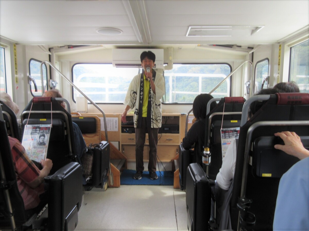 なんと今回は、道の駅阿賀の里の関仁社長、奥阿賀コンビリーの柳沼陽介代表のおふたりがツアーバスに乗車して、町の歴史やおすすめスポットを楽しく紹介してくださいました。