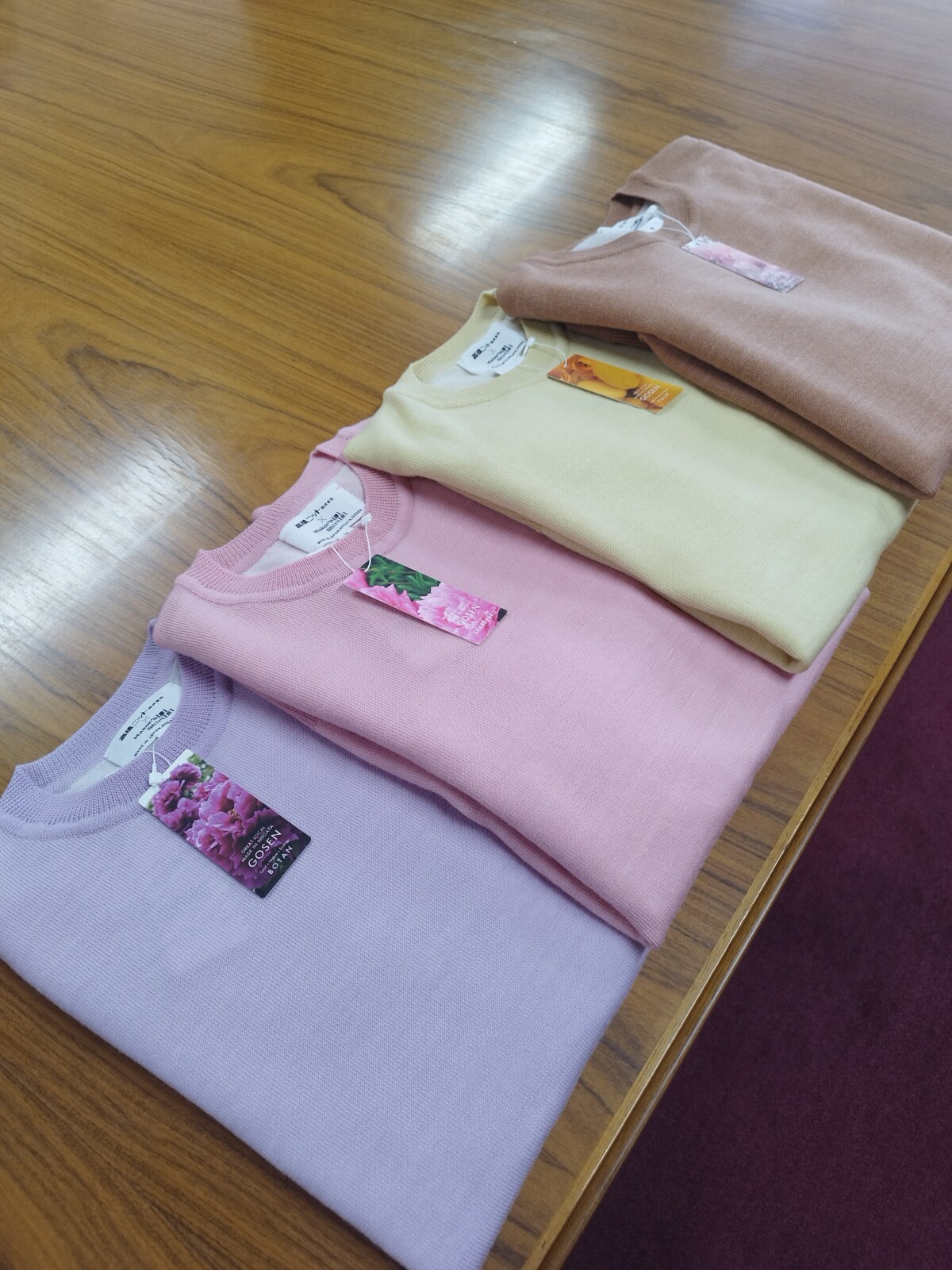 五泉産のボタン、シャクヤク、チューリップ、八重桜の花びらから抽出した天然色素で染め上げました。糸には、しっかり感と繊細さを合わせ持ち、発色性に優れたものを選択。メーカーズシャツ鎌倉の染色技術(ボタニカルダイ)と高橋ニットの製造技術が融合した高品質なニット製品に仕上がりました。