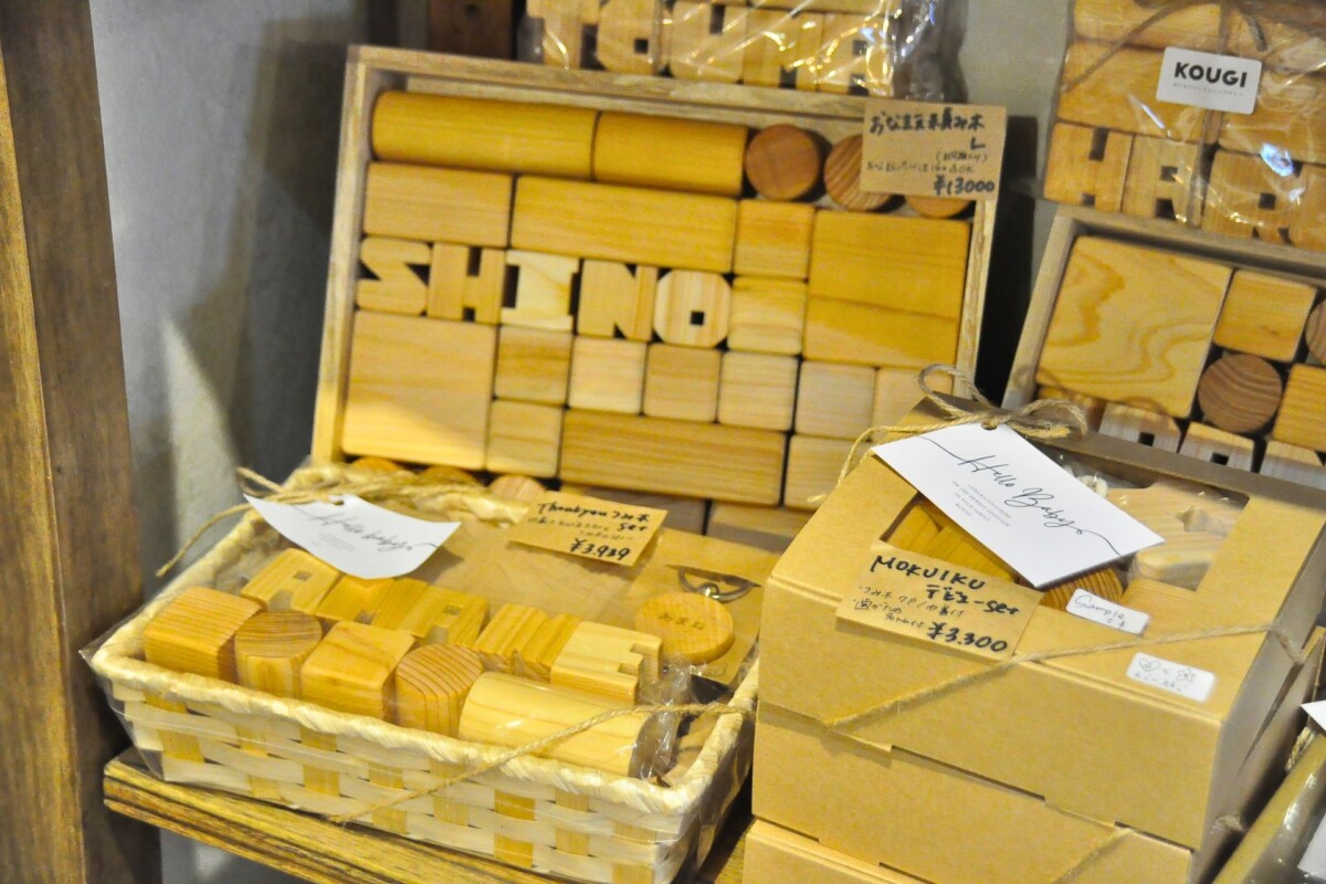 KOUGIの看板商品でもあるおなまえ積み木。お店にサンプルも置かれています