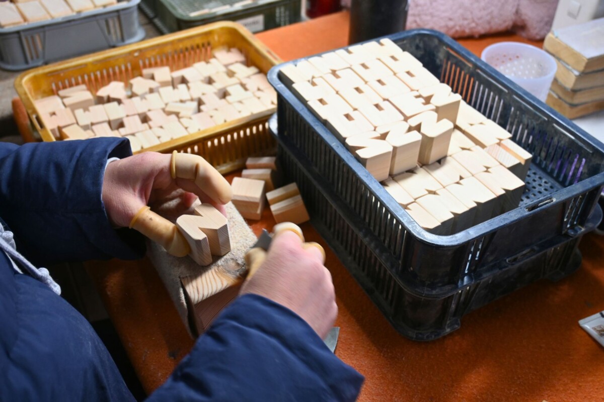 おなまえ積み木はスタッフの皆さんによる手作業で作られていきます