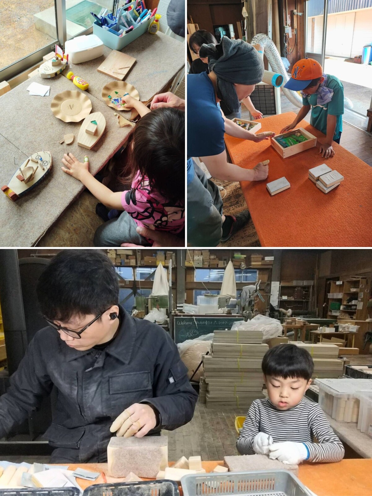 ワークショップの様子。木育インストラクターの資格を取得した香那子さんは「ものづくりは大変だけど、楽しいよということをお子さんにも親御さんにも知ってもらえたら」と、定期的に木育のワークショップを開催。ちなみに木育とは、子どもから大人までが木に触れ、木に学び、木と生きる活動のことで、子どもの五感と感性を育むことを目的としています
