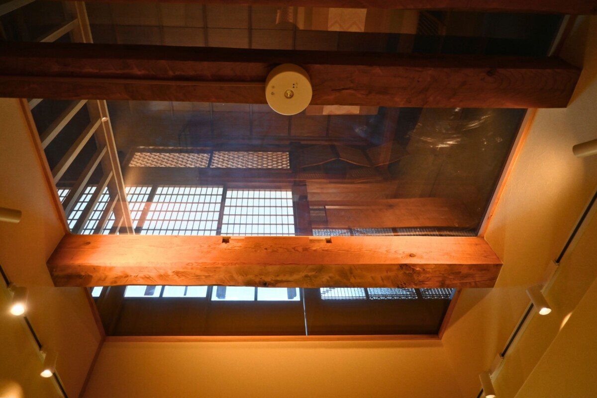 お二人が特にこだわったのは、古民家らしい風情を残すことでした。お食事処満るかの店内は吹き抜けになっていて、お店がある1階と2階との間に設けられた欄間細工は、まさにその象徴です。